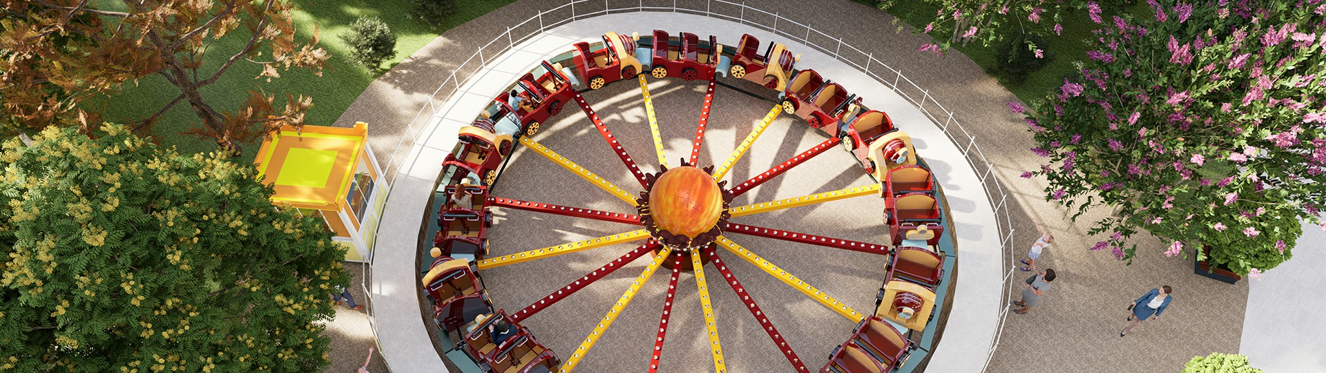YKC-48B型烈焰戰(zhàn)車(chē),以戰(zhàn)車(chē)追逐恒星為主題,中間支撐座裝有回轉(zhuǎn)支承連接16條轉(zhuǎn)臂。每條轉(zhuǎn)臂自帶行走輪,其中四條轉(zhuǎn)臂帶有驅(qū)動(dòng)裝置,而16個(gè)座艙分別安裝在轉(zhuǎn)臂之間。轉(zhuǎn)臂行走輪下方布置有環(huán)形的起伏路軌,在轉(zhuǎn)臂驅(qū)動(dòng) 裝置的驅(qū)動(dòng)下,烈焰車(chē)體圍繞中心的恒星高低起伏轉(zhuǎn)動(dòng),座艙隨轉(zhuǎn)臂旋轉(zhuǎn)運(yùn)動(dòng) 的同時(shí),并沿路軌上下運(yùn)動(dòng),使乘客體驗(yàn)多重復(fù)合旋轉(zhuǎn)運(yùn)動(dòng)帶來(lái)的樂(lè)趣。